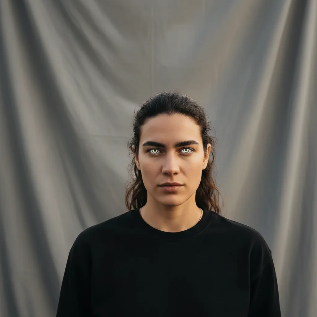 Prompt: replace beach and ocean with blurred neutral backdrop, maintain the golden hour lighting quality, enhance eyes dramatically with strong catchlights, keep the intense cinematic mood