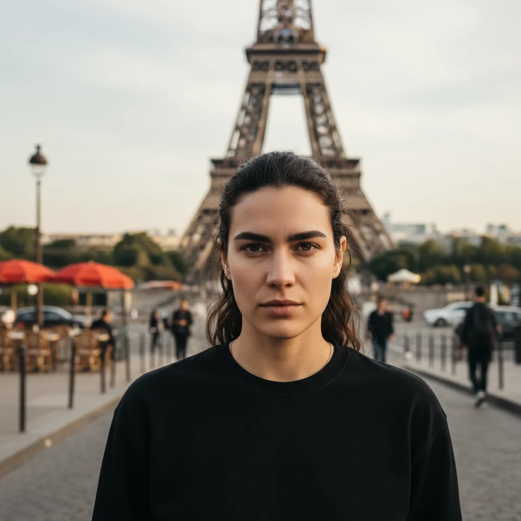 Woman with intense natural expression, Eiffel Tower and Paris street visible in background