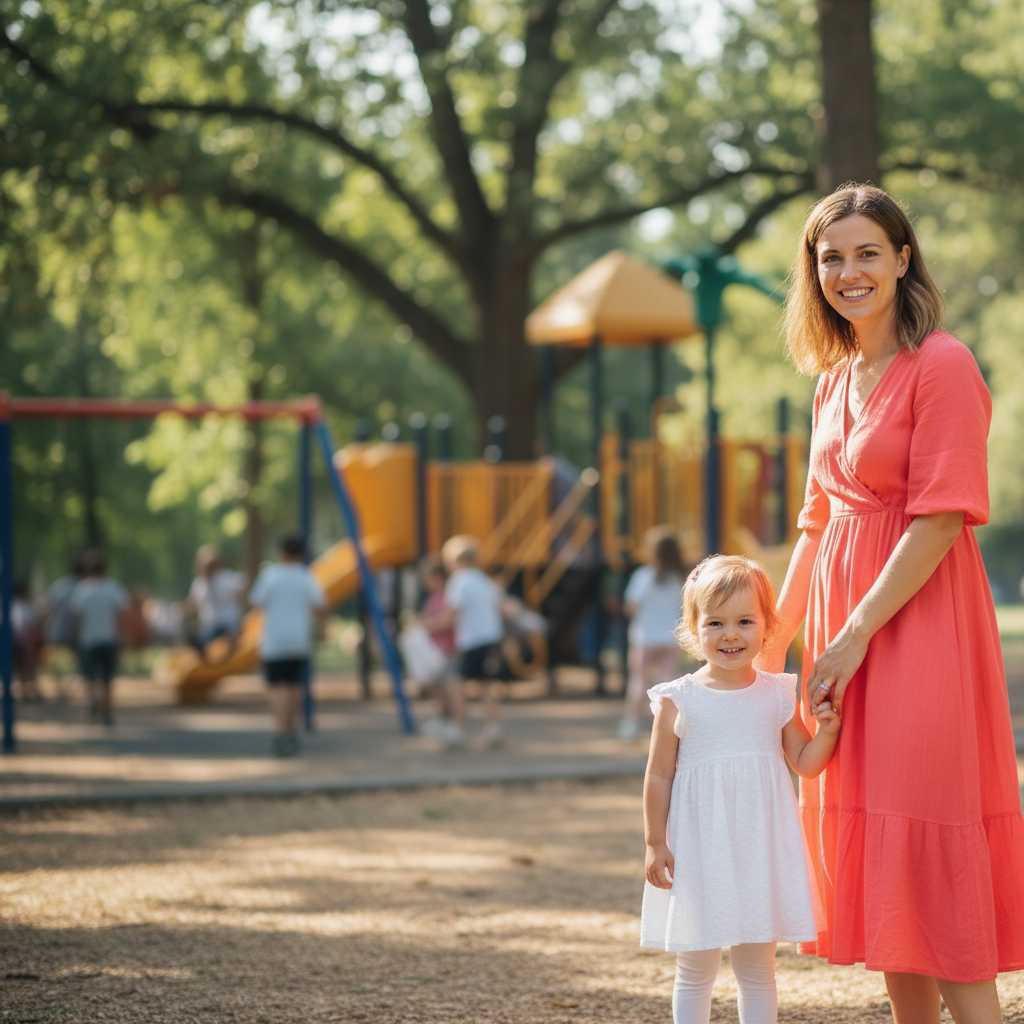 Two people photographed at a park with playground equipment and other families behind. Blur kept both subjects sharp while softening the distracting background.
