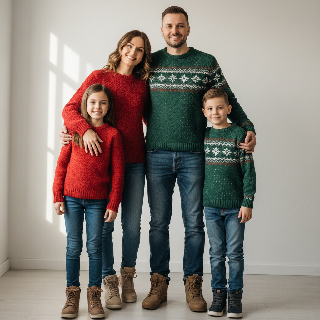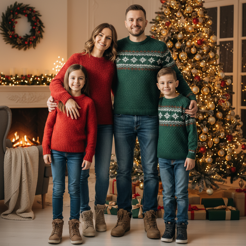 Tip: Include lighting details: 'warm golden Christmas lights,' 'soft fireplace glow,' or 'snowy winter daylight' to match your subjects naturally.