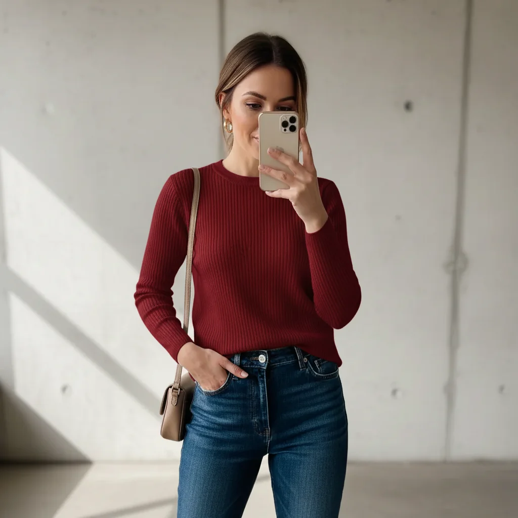 Prompt: change the dress to burgundy red, preserving fabric texture and folds