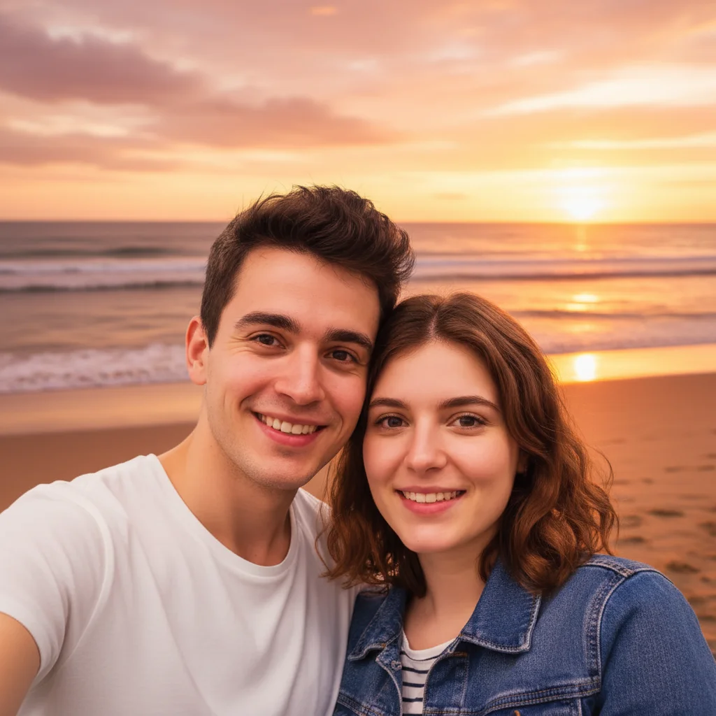 A casual indoor couple selfie transformed into a romantic sunset beach scene with golden hour lighting.