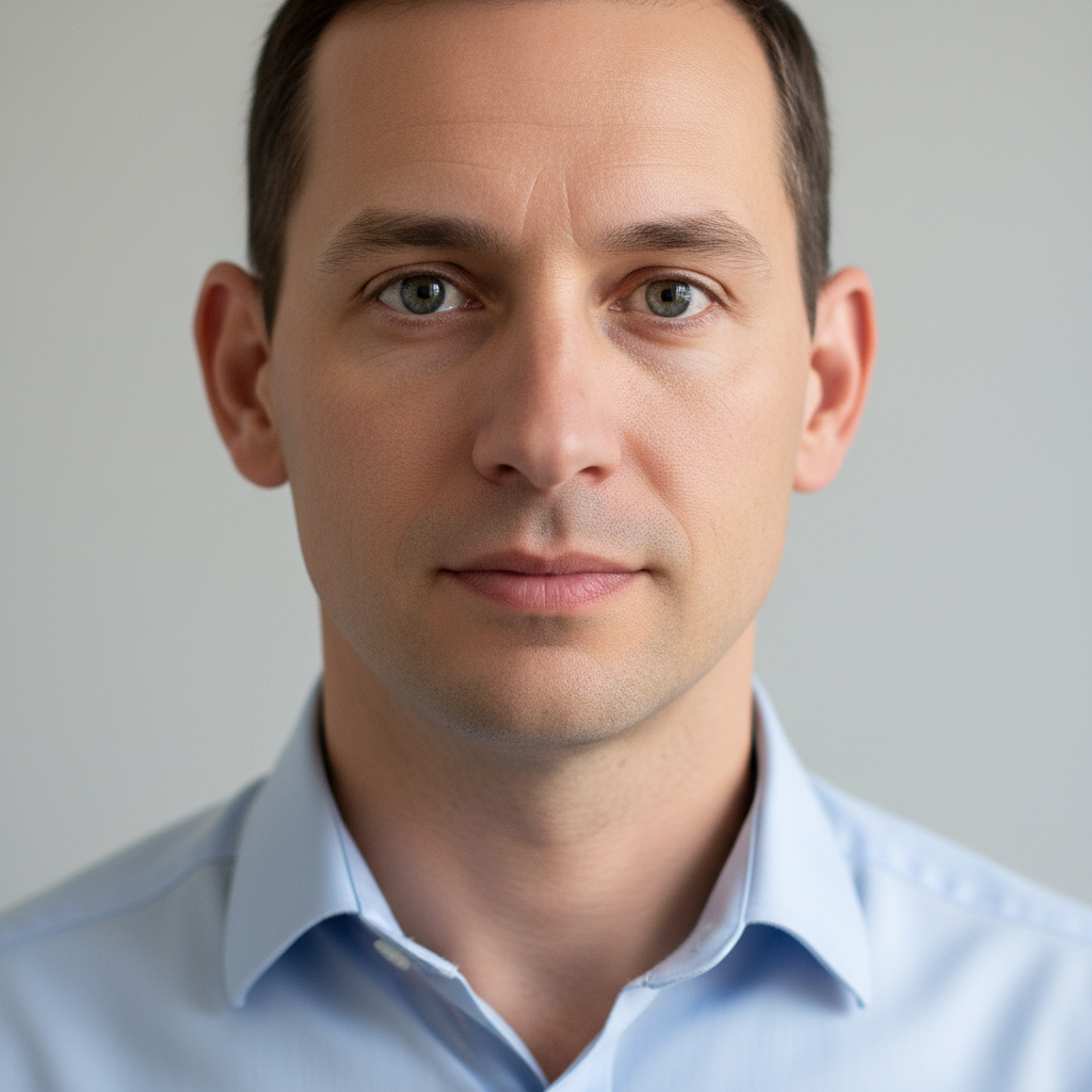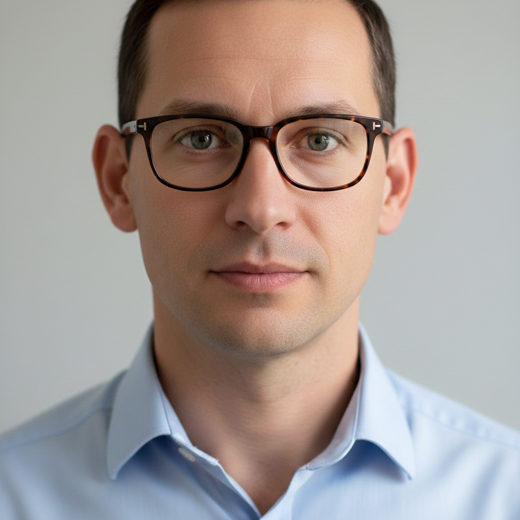 A portrait without glasses enhanced with classic round tortoiseshell frames to preview the look.