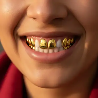 A grill is a removable decorative cover that fits over teeth, while gold teeth usually refers to permanent gold caps or crowns. This AI tool can preview both styles - use 'grill' for full coverage looks or 'gold tooth/teeth' for individual permanent-style gold. The visual result is similar.