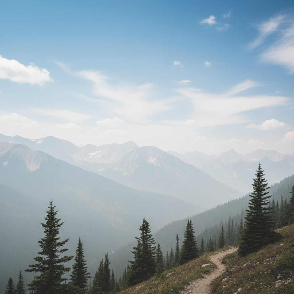 Thick atmospheric haze obscured distant peaks. One prompt revealed the mountain details with enhanced clarity.