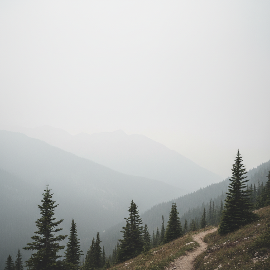 Mountain landscape with heavy atmospheric haze obscuring distant peaks