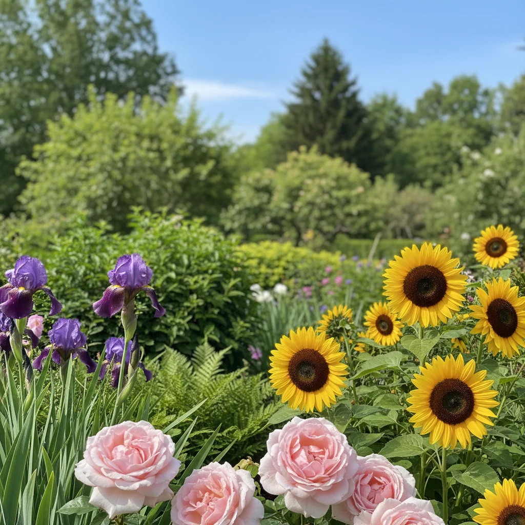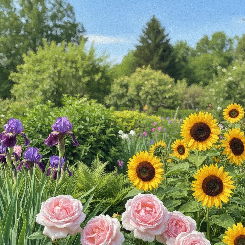 transform this photo into an impressionist painting with visible brushstrokes, soft edges, and vibrant flower colors like Monet's garden paintings