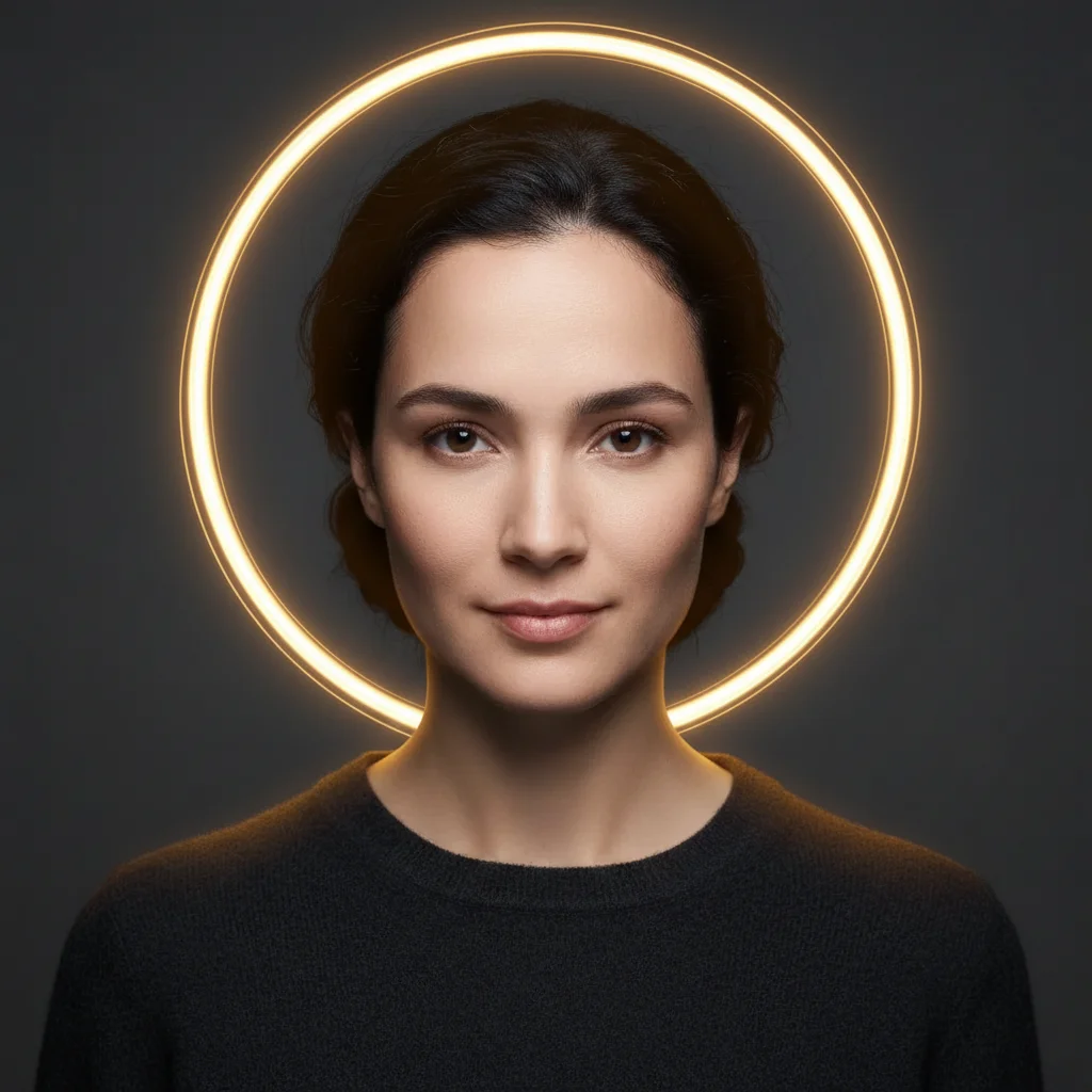 Prompt: add glowing golden light trail forming a perfect circle around the subject's head like a halo, with soft warm glow and slight motion blur
