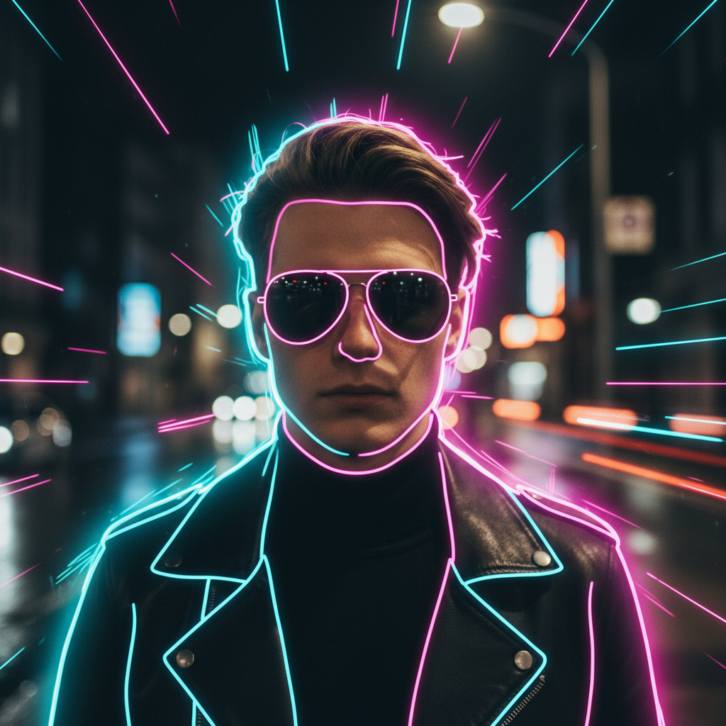 Added pink and cyan neon glow to portrait for synthwave aesthetic.