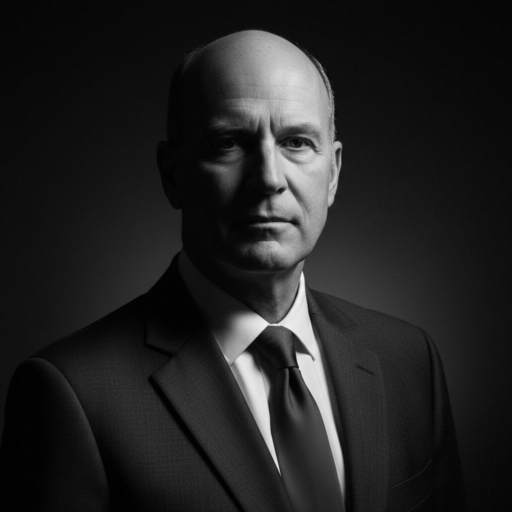 Prompt: convert to noir style with hard shadows across the face and bright rim lighting