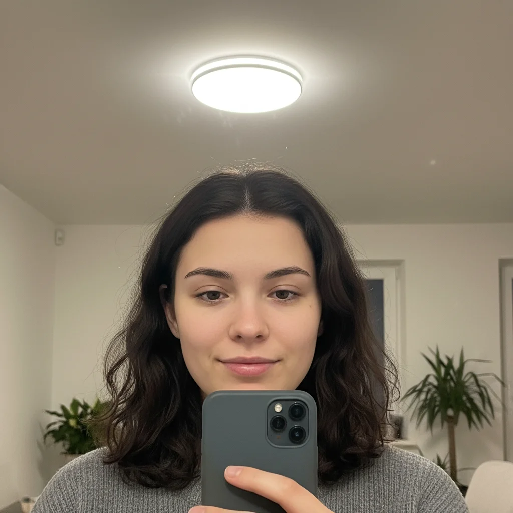 Basic selfie with flat lighting. AI added classic Rembrandt setup with characteristic triangle of light under eye.