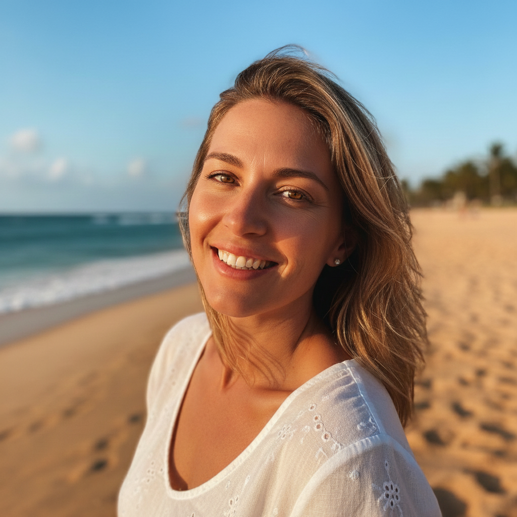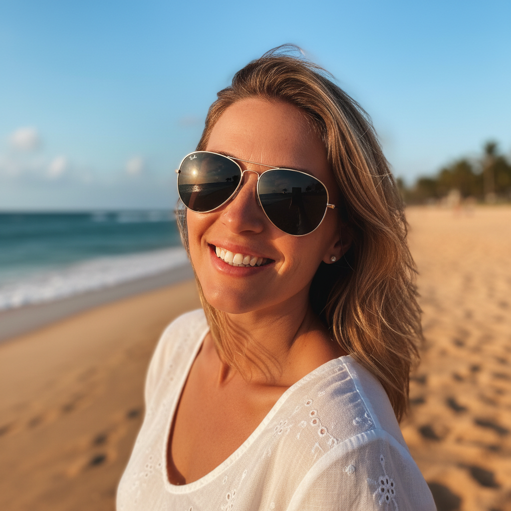 Beach selfie with reflective aviators. Removed sunglasses to show eyes while preserving the candid outdoor vibe.