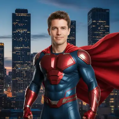 Upload a clear portrait to EditThisPic and describe your ideal superhero: 'make me a superhero with [suit color], [cape/no cape], [powers], and [background].' The AI preserves your face while adding the superhero elements in about 30 seconds. Include power effects and a dramatic background for the most impressive results.