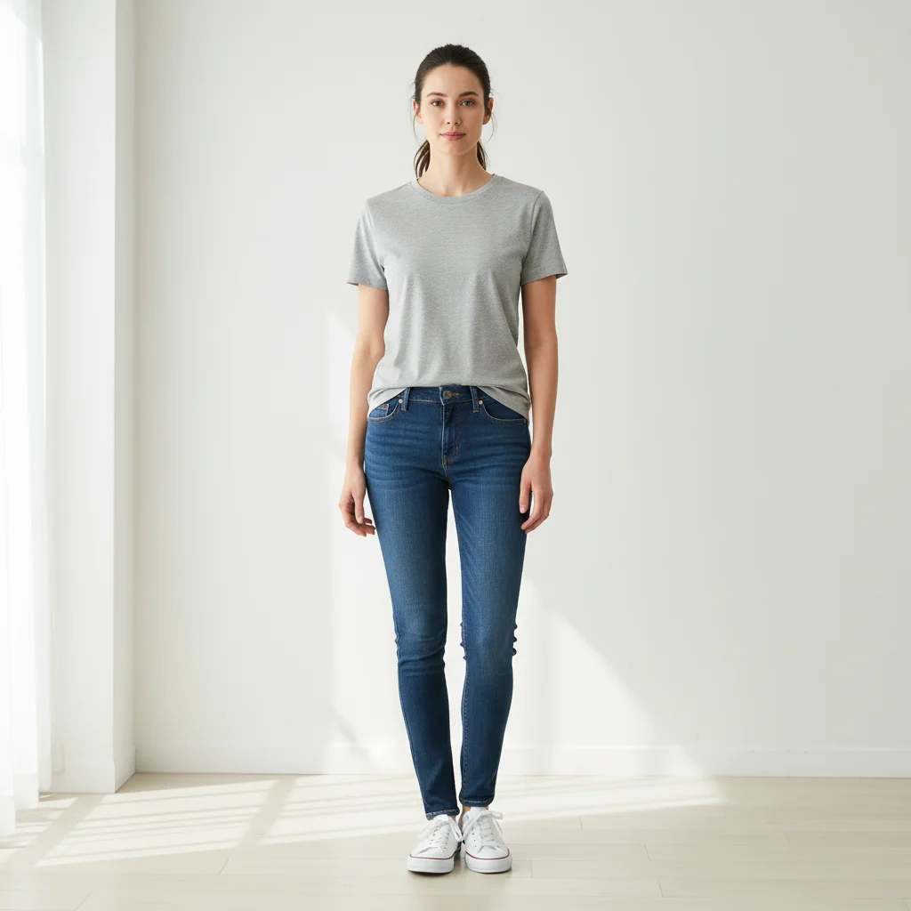 A woman in everyday clothes transformed into a bride wearing a classic A-line wedding gown to preview the silhouette.