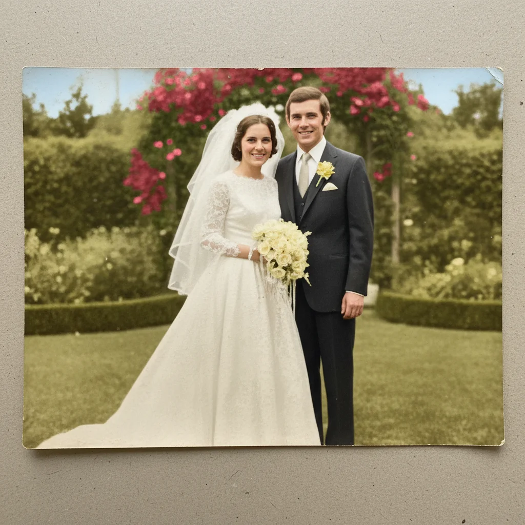 Prompt: restore this vintage wedding photo and enhance the severely faded colors, make it vibrant and worthy of our 50th anniversary