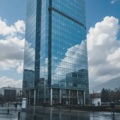 A glass tower shot on an overcast day. Sky replaced with blue sky featuring white clouds.