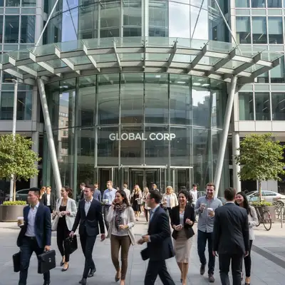 A modern office building entrance with busy lunchtime crowds. All people removed, plaza surface cleanly filled.