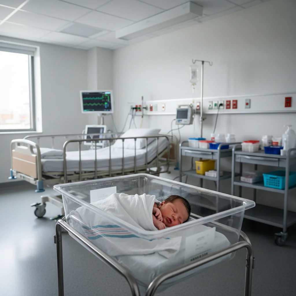 A birth announcement photo taken in a hospital room with medical equipment visible. The AI replaced the clinical background with a dreamy soft white nursery setting and removed all visible medical equipment.
