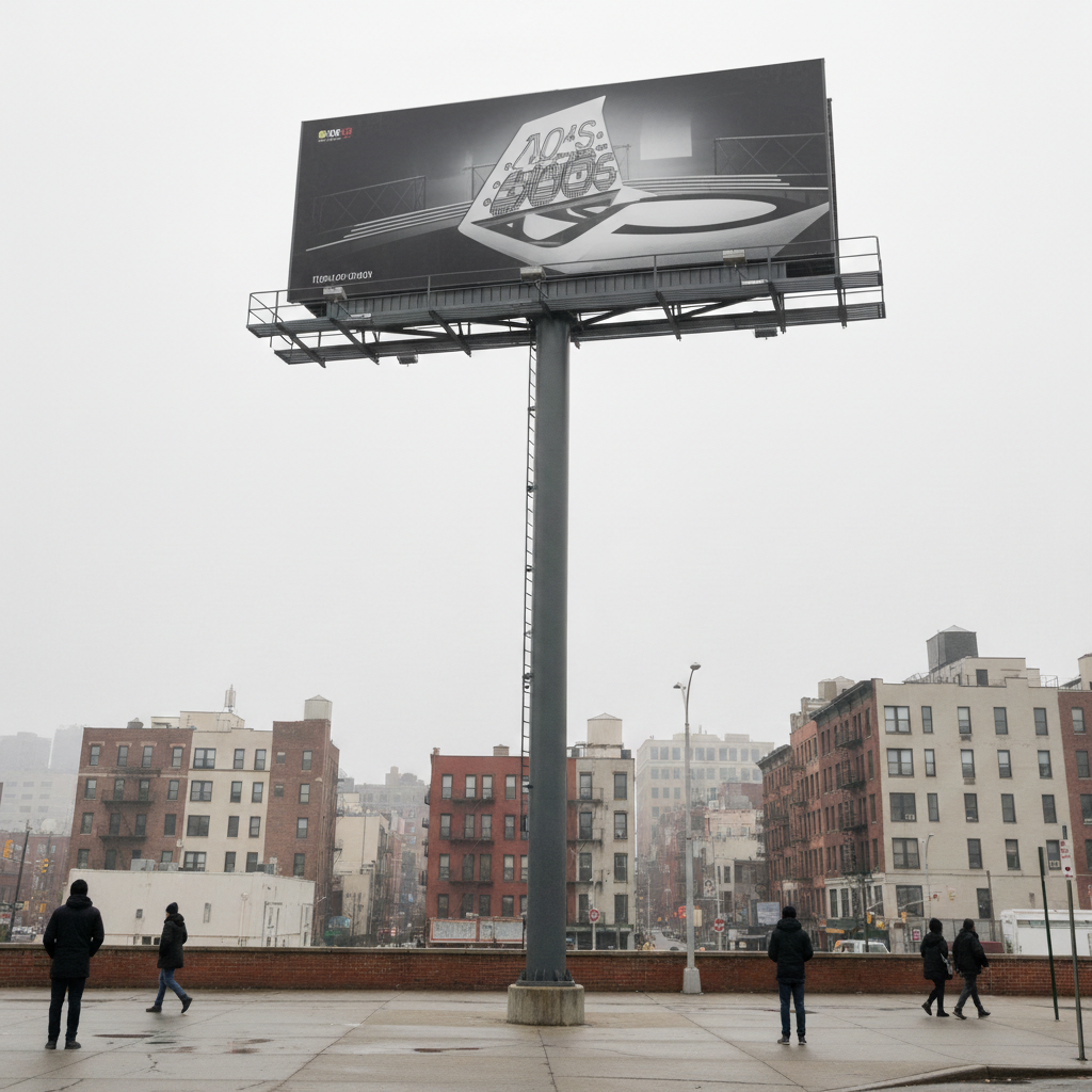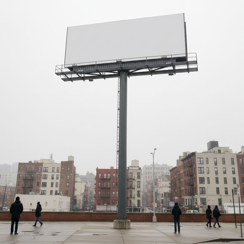It works for any flat or near-flat display surface: 48-sheet and 96-sheet roadside billboards, 6-sheet bus shelter panels, subway and transit posters, retail window graphics, building-wrap hoardings, digital LED screens, and outdoor kiosks. The key requirement is a clear photo showing the display panel where your design should appear. Curved displays like wrapped buses require additional refinement prompts.