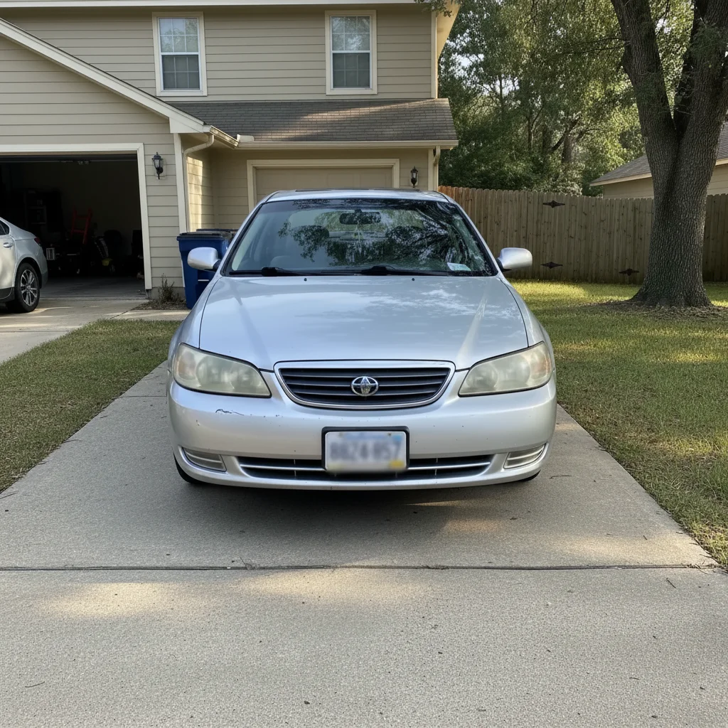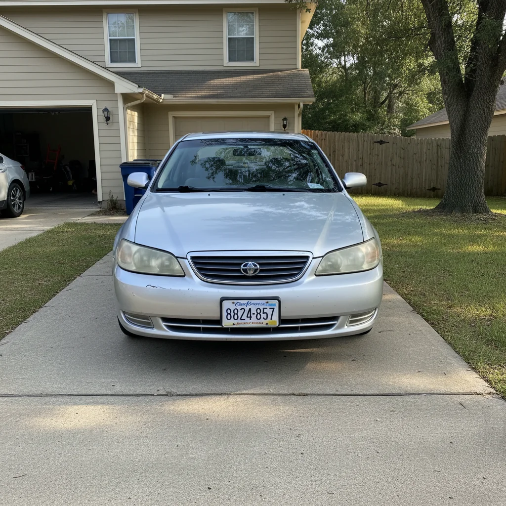 Used car photographed in driveway for Facebook Marketplace. One prompt blurred the plate for privacy before posting.