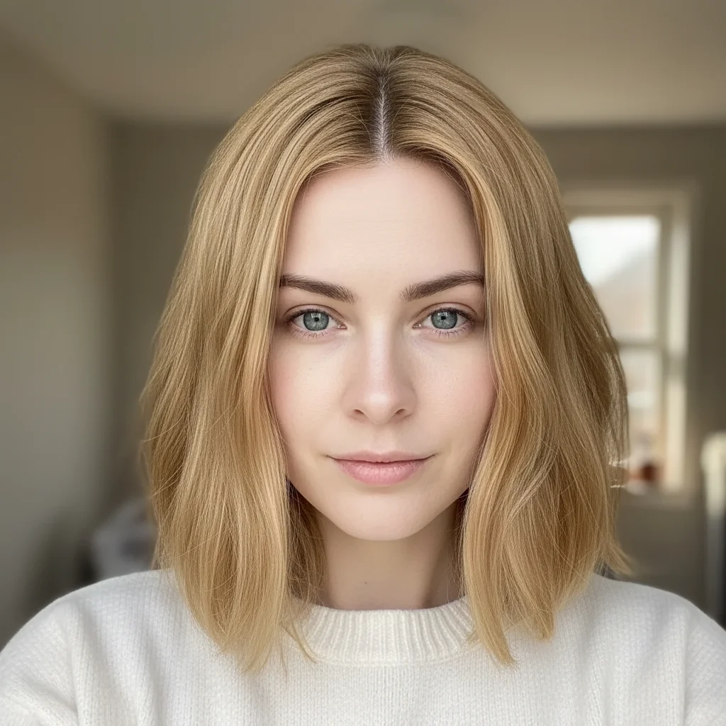 change hair color to warm honey blonde with subtle highlights, natural-looking roots