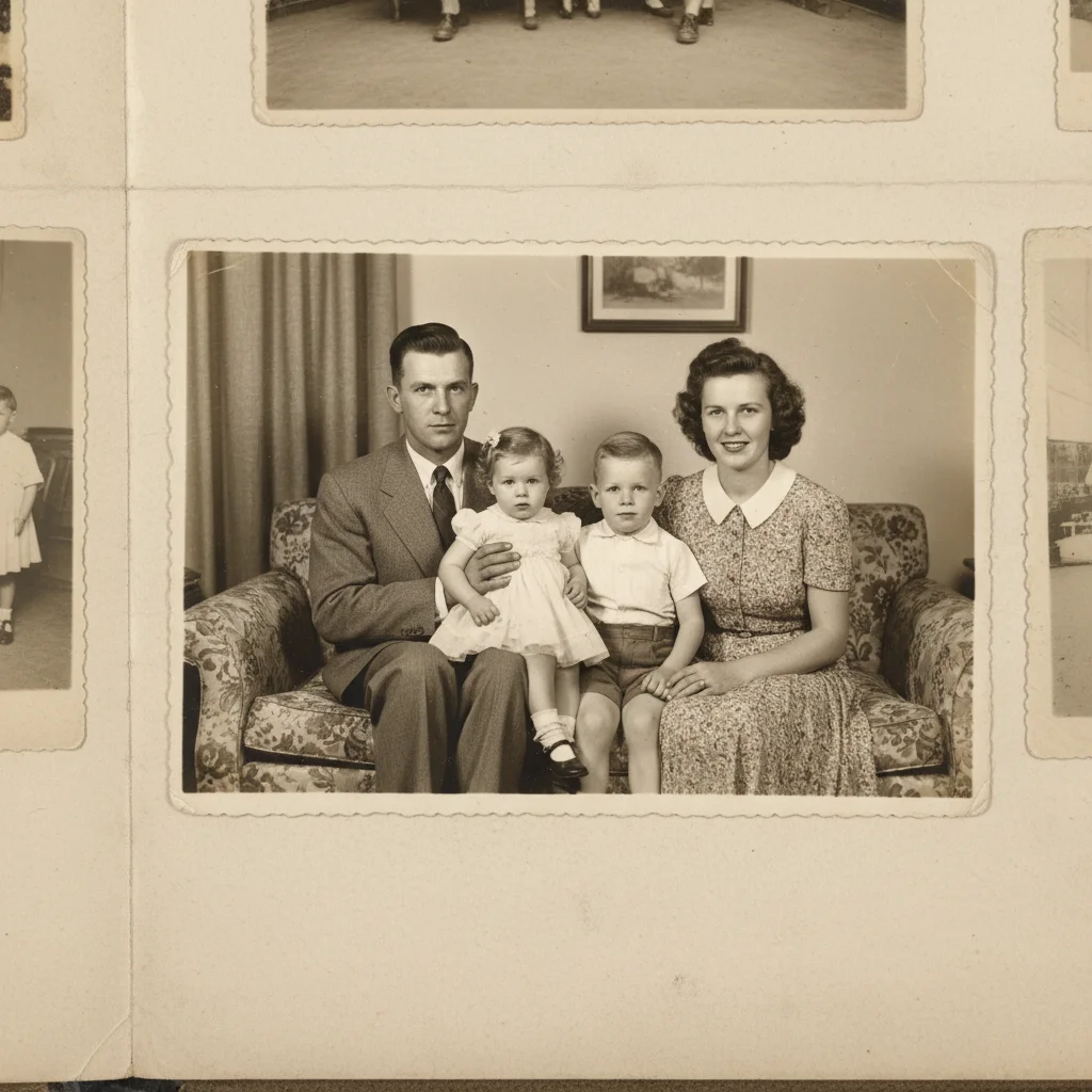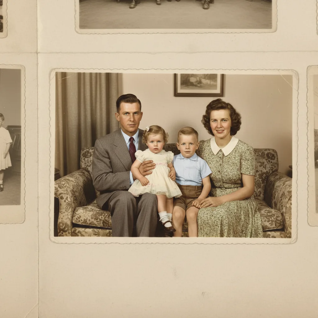 A treasured family photo from 1952 found in grandmother's album. One prompt brought natural colors to three generations.