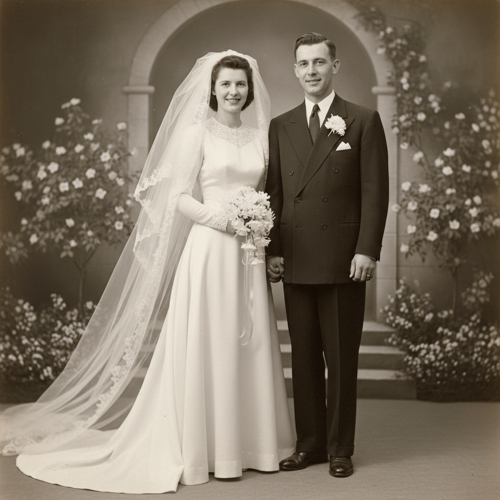 A precious 1948 wedding photo found in a family album. One prompt brought this once-in-a-lifetime moment back to life with natural, dignified colors.