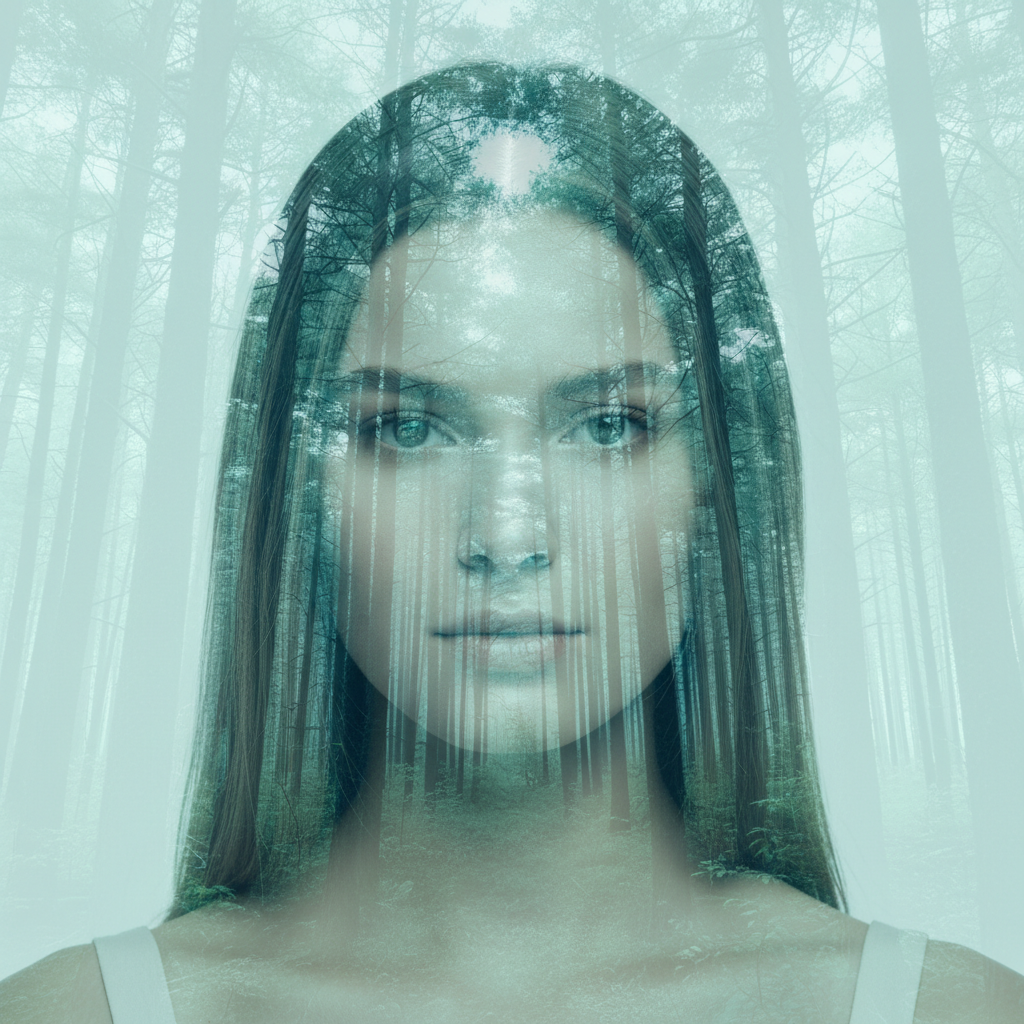Use a front-facing or profile portrait with a plain or dark background as your primary photo. Upload a high-contrast landscape — mountains, forest, ocean, or cityscape — as the reference image. Describe the tonal mood you want: 'cool blue cinematic blend' or 'warm amber dreamlike quality.' The AI matches the luminosity of both images and merges them using a photographic screen blend. Specifying a single color grade prevents the two images from clashing.