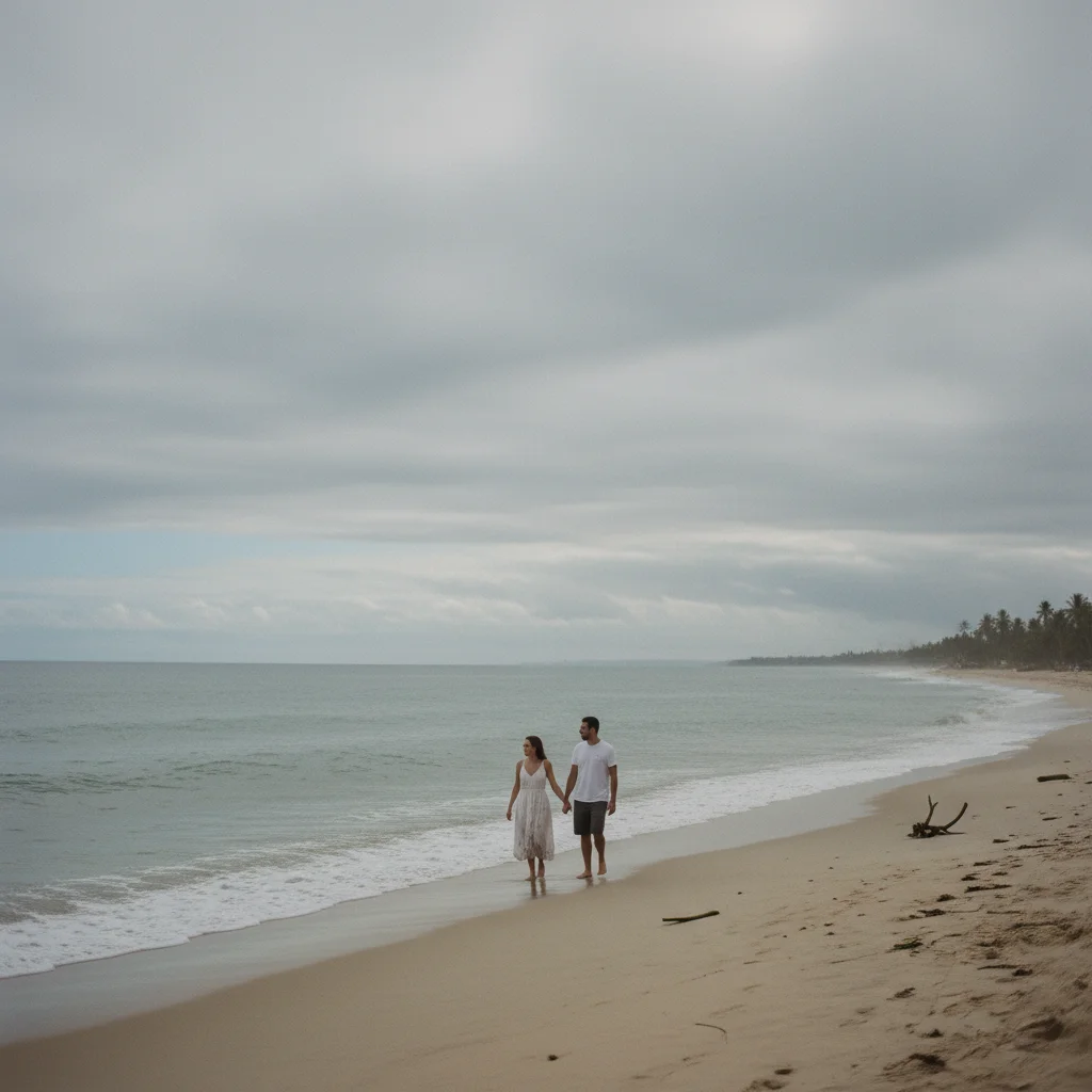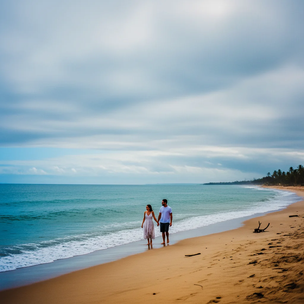 Vacation photo taken on a cloudy day with flat, gray tones. One prompt brought back the vibrant blues and warm sand colors.