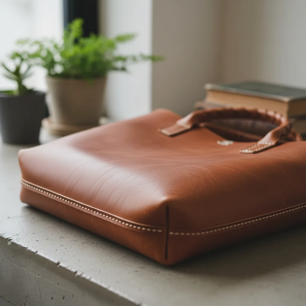 Handmade leather bag photographed with phone camera looked soft. One prompt brought out the grain and stitching for the online store.