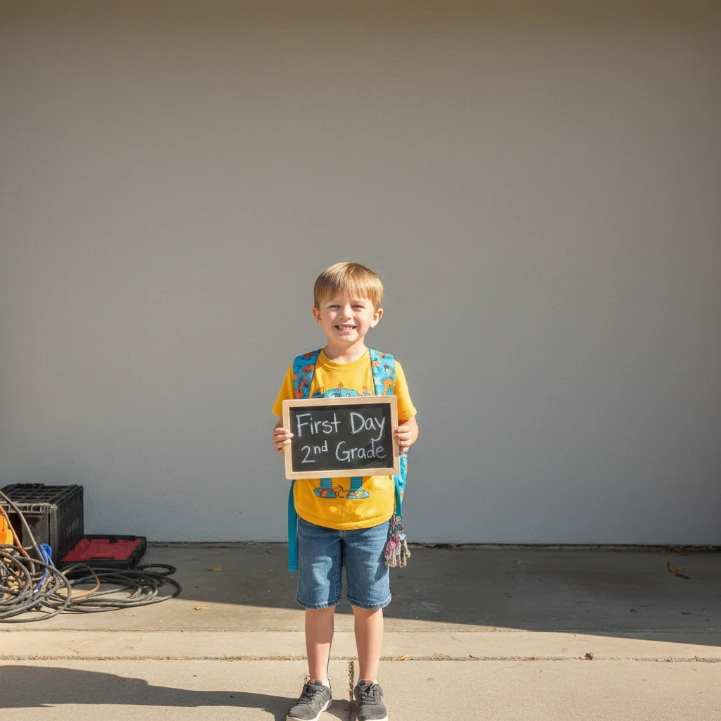 Not at all. You're not changing your child or faking the moment—you're removing morning chaos that photobombed an annual milestone. The rushed garage background isn't part of the memory you want to preserve. If cleaning it up makes you prouder to display and share the photo, that's what matters.