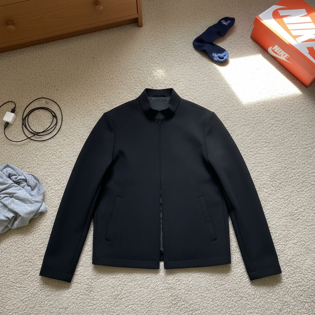 Raf Simons jacket photographed on bedroom floor with clutter. One prompt created archive-quality listing photo.