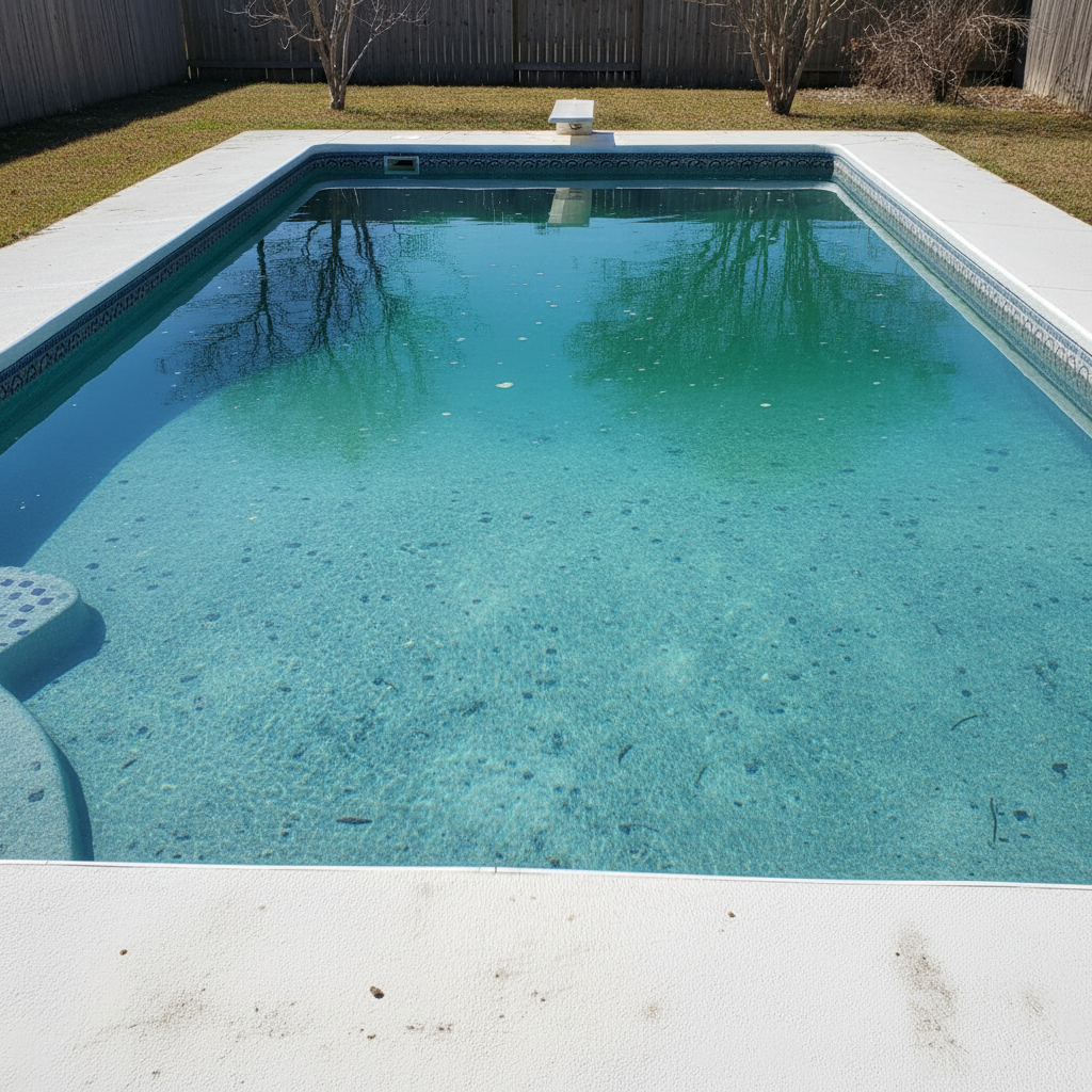 Real estate listing pool with visible green algae transformed into crystal clear inviting blue water.