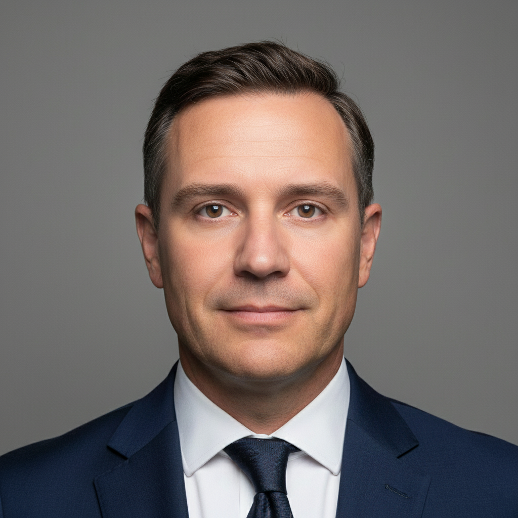 Home office headshot where a computer screen created rectangular glare patches on the glasses. Professional result ready for LinkedIn.