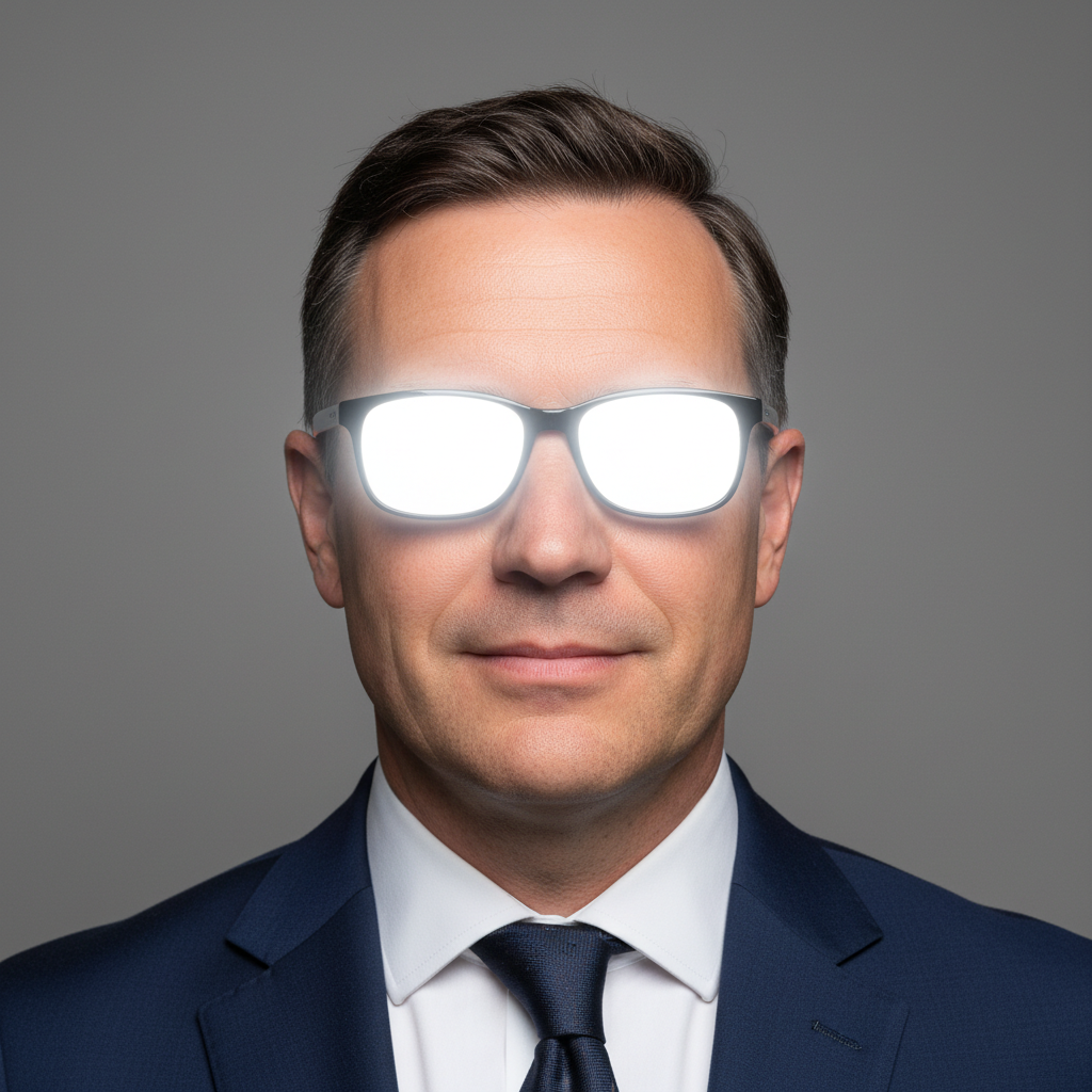 Studio headshot where the flash created a bright white reflection across both lenses, completely hiding the eyes. One prompt revealed natural eyes.