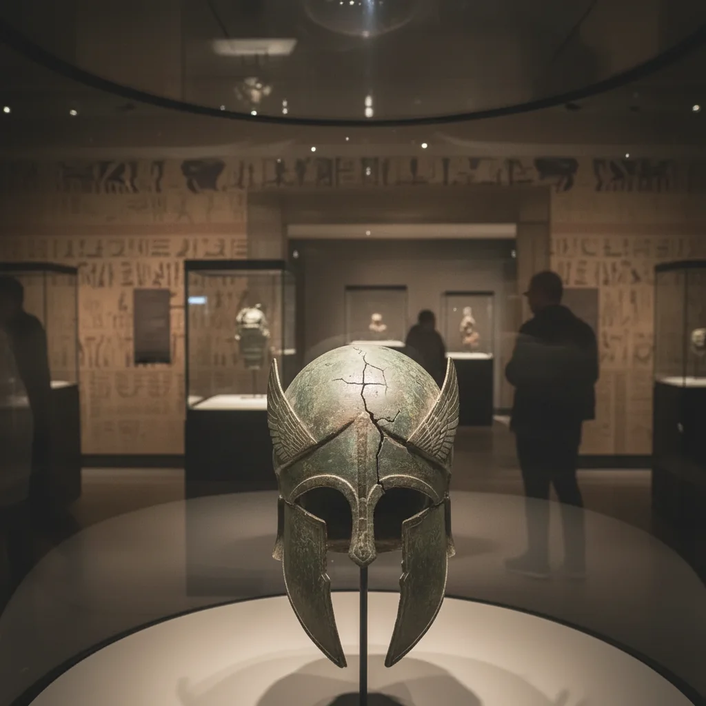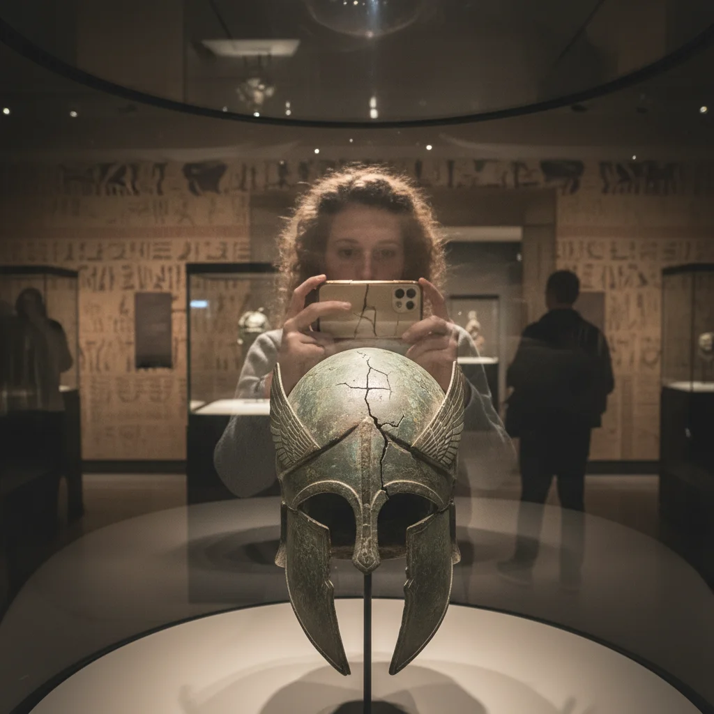 Tried to photograph an ancient helmet but caught my ghostly reflection in the glass. Now just the artifact.