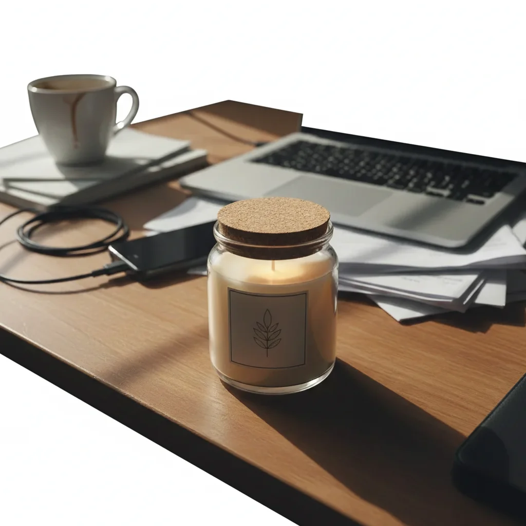 Handmade candle photographed on cluttered home desk. One prompt created a professional Shopify product photo with clean white background.