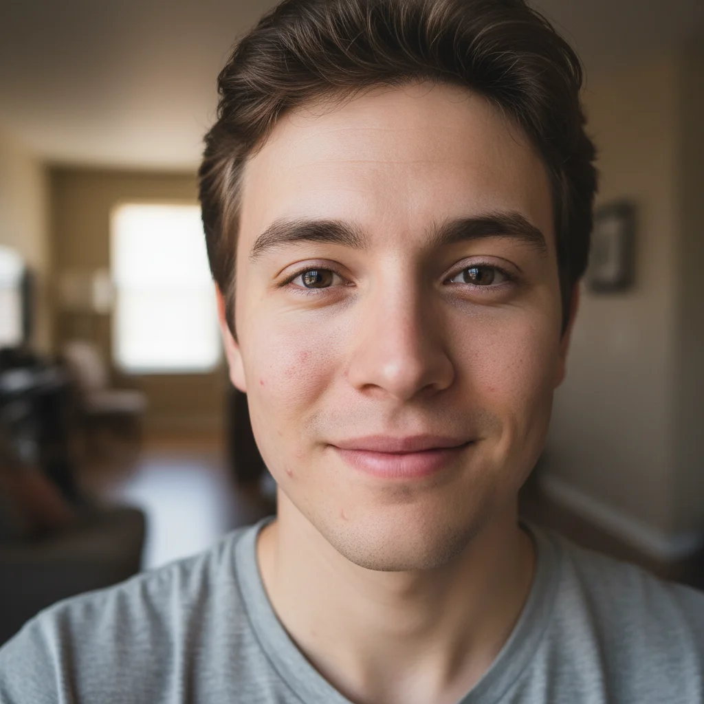 Casual selfie with visible pores and minor blemishes. One prompt created natural, photo-ready skin without the fake look.