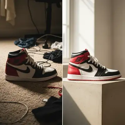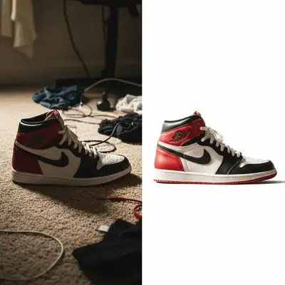 Jordan 1 High photographed on messy bedroom carpet. One prompt created authentication-ready white background with enhanced condition visibility.