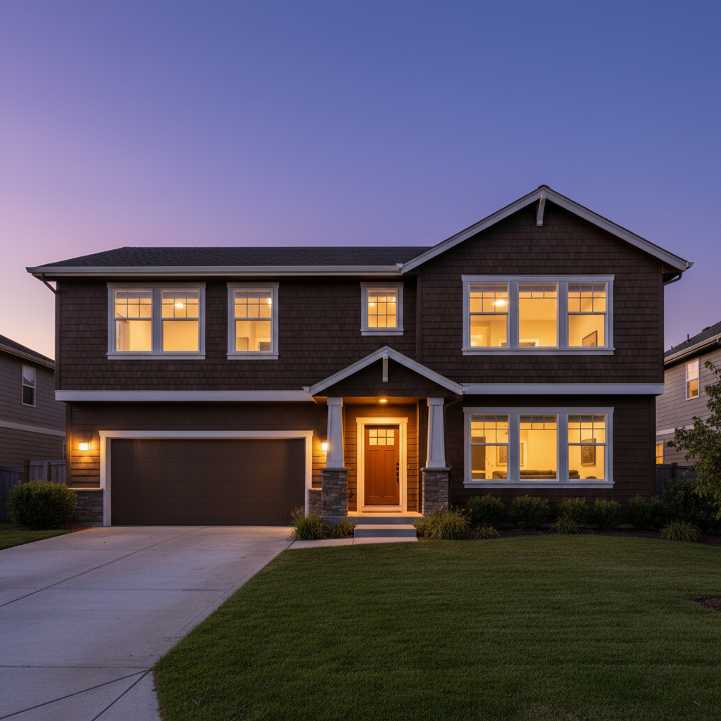 Same home at golden hour with orange sunset sky and warm glowing windows