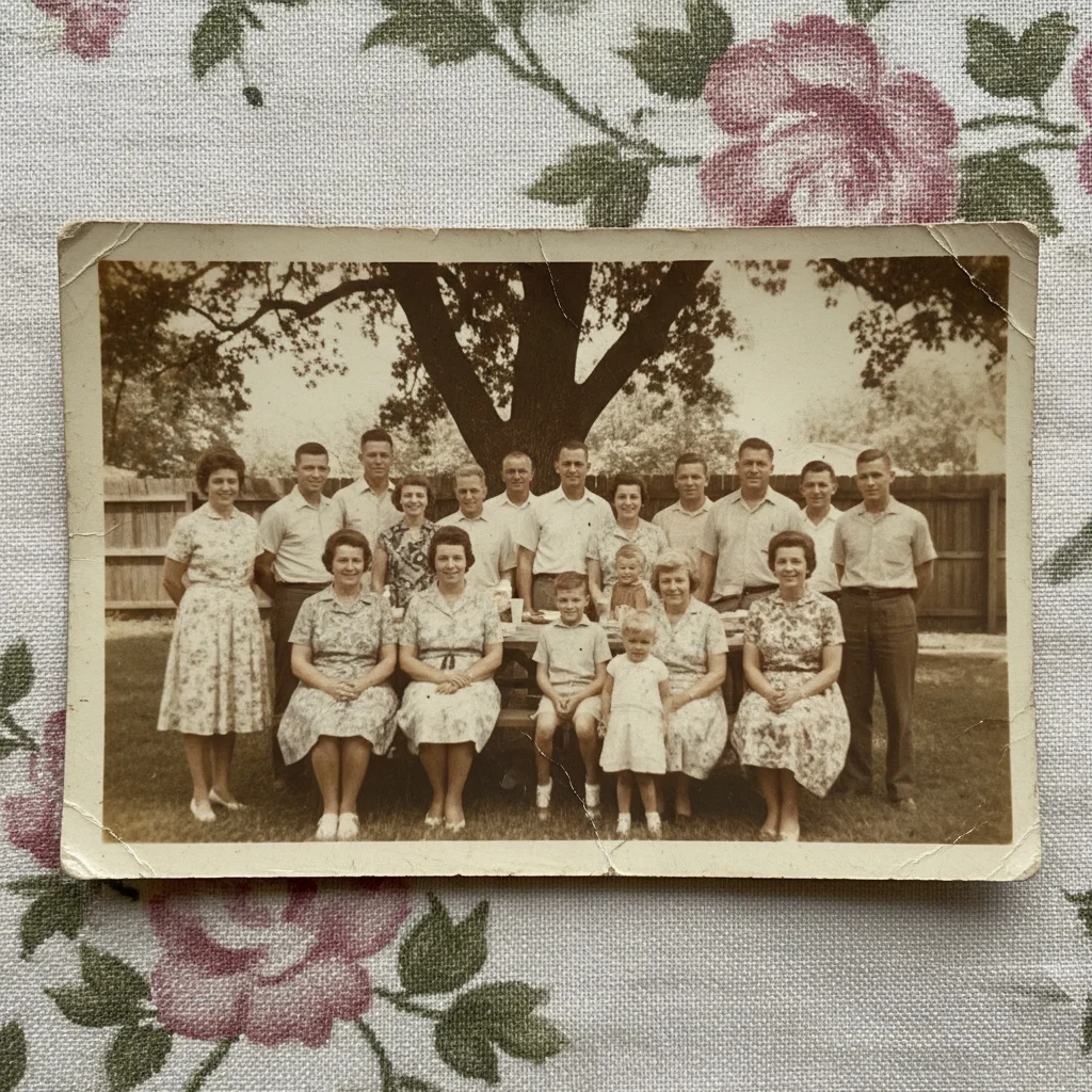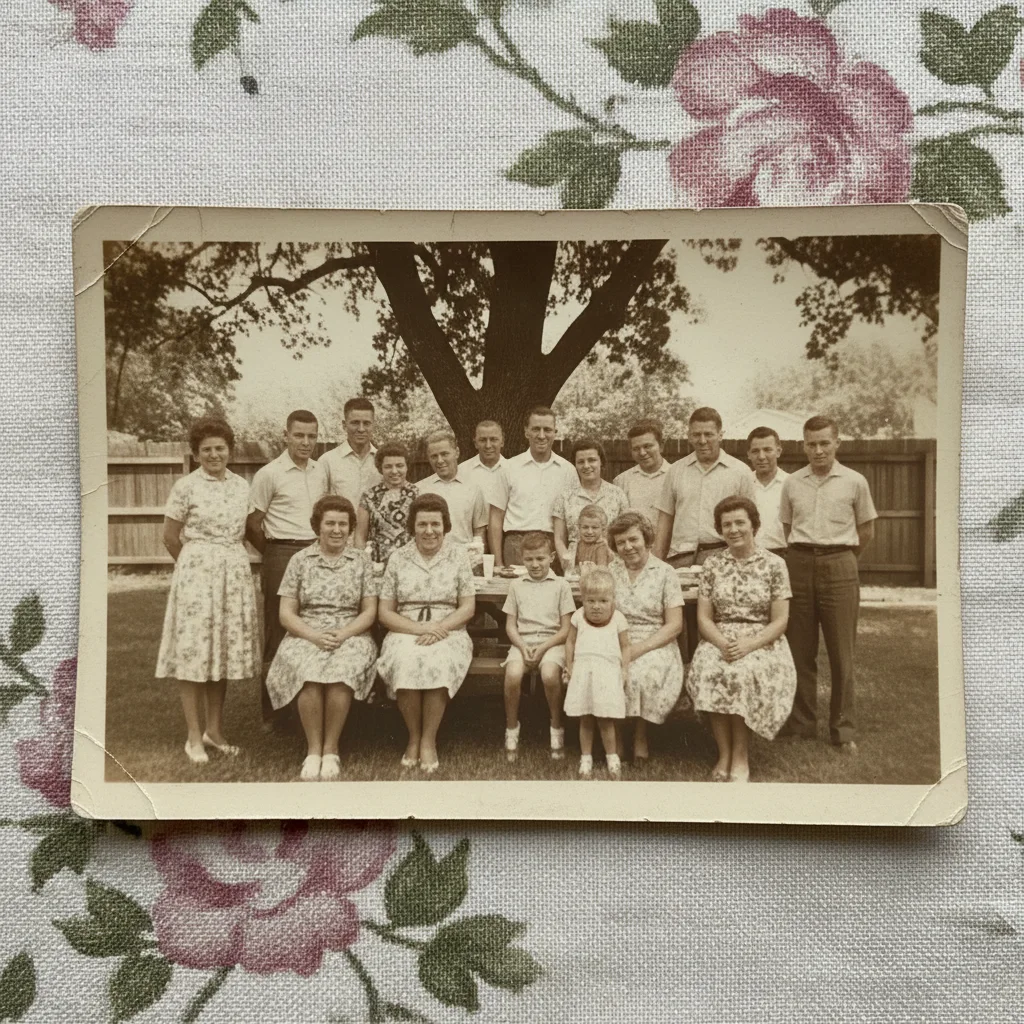 Faded color snapshot from a family reunion found in grandmother's album. Upscaled for a memorial slideshow, faces now clearly recognizable.