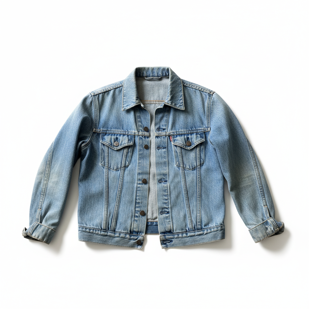 replace the messy background with clean white, keep the denim jacket exactly as it is showing natural wear