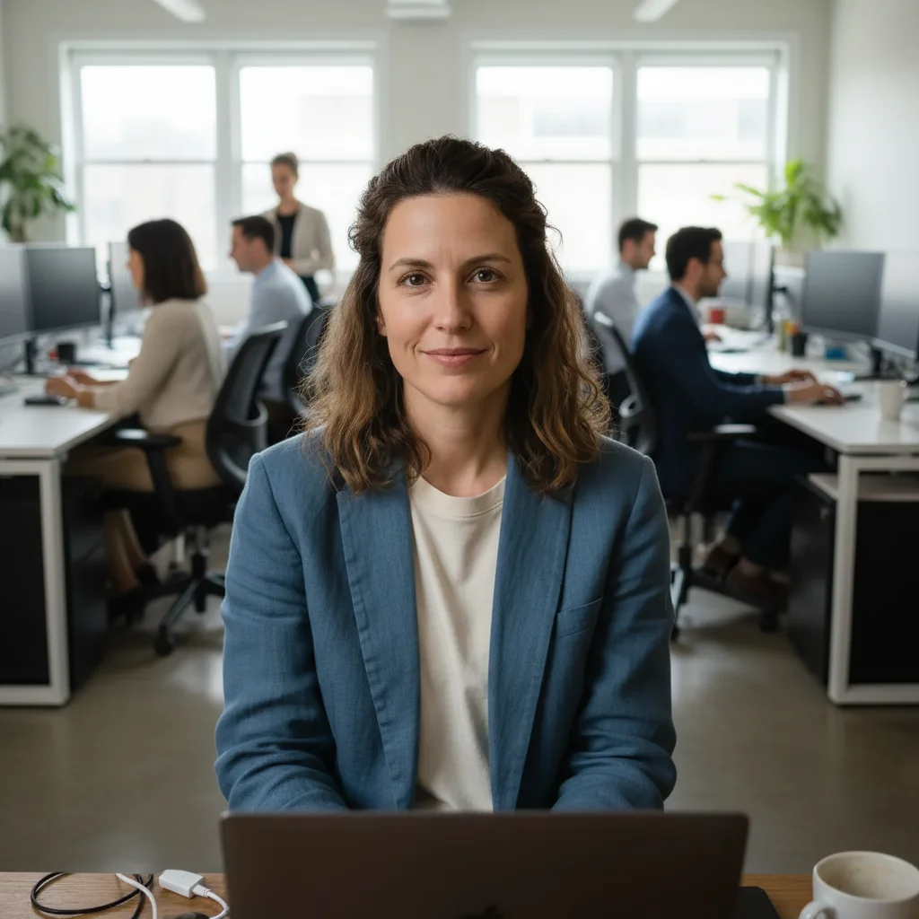 Prompt: replace bedroom background with professional office environment, make it look like a real business team photo