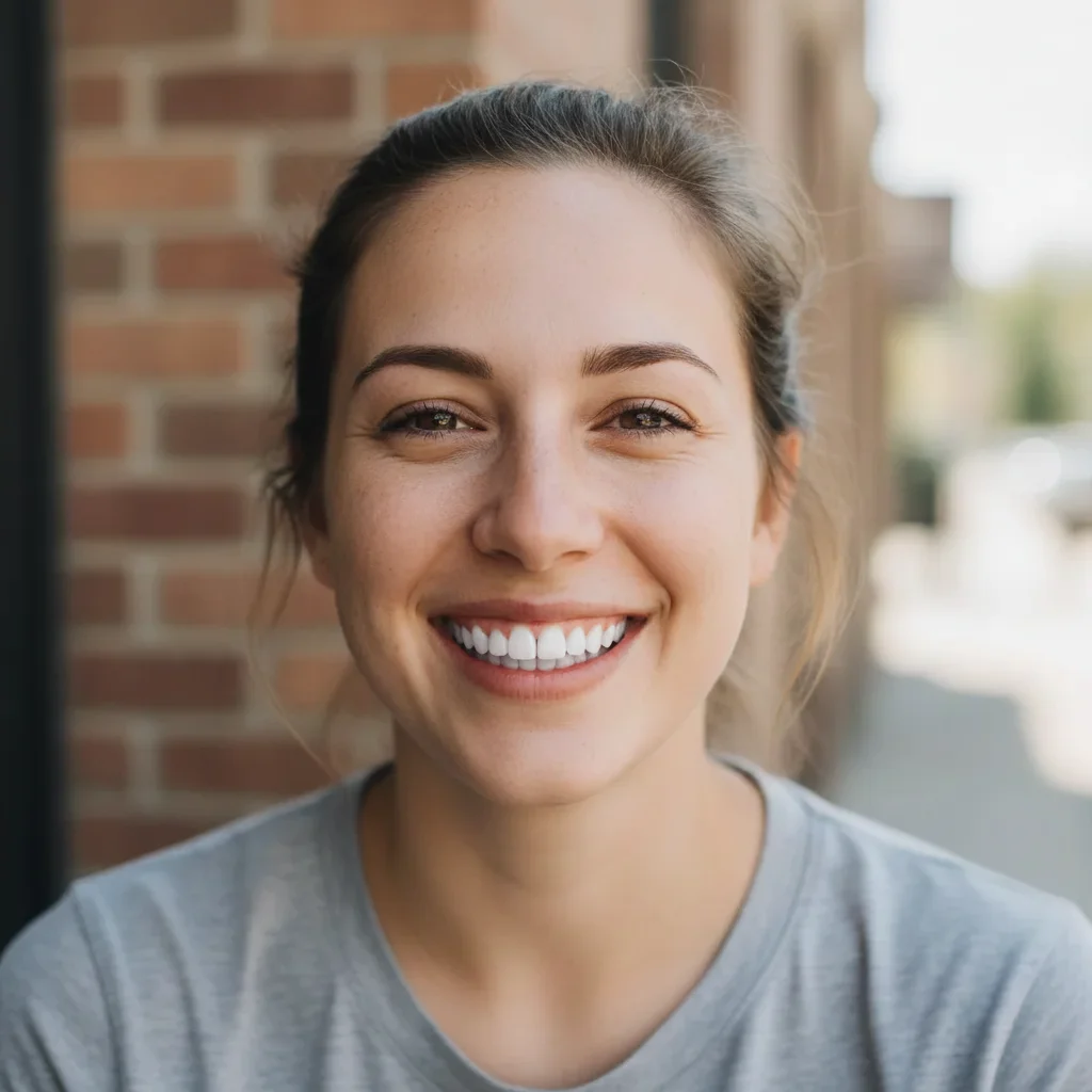 Casual portrait with slightly yellowed teeth from coffee stains. One prompt created a bright, natural-looking smile.