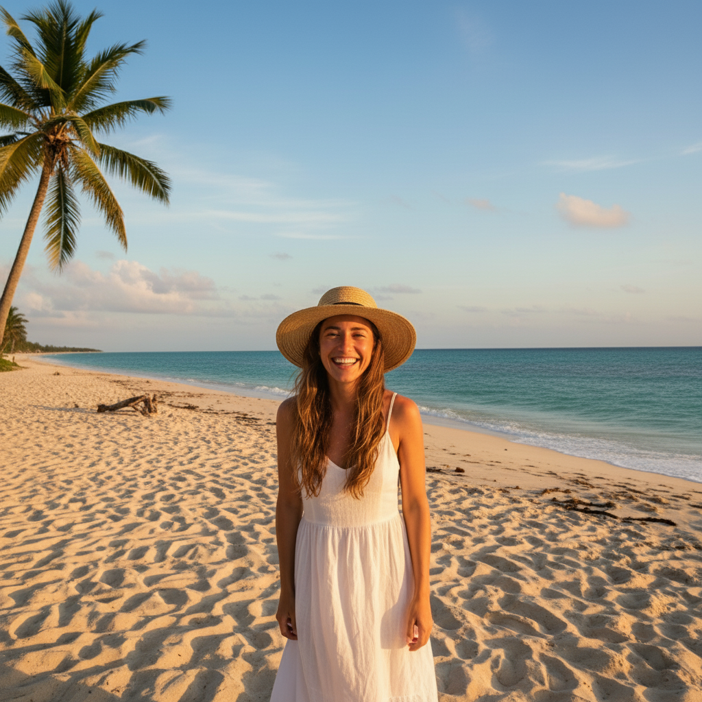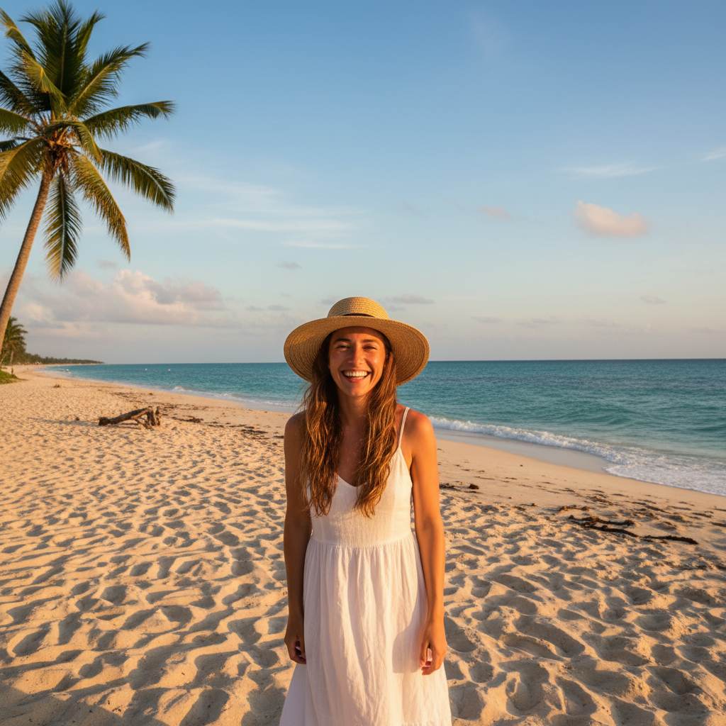 A vertical portrait needed to become a horizontal cover. The AI extended the beach background on both sides seamlessly.