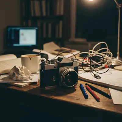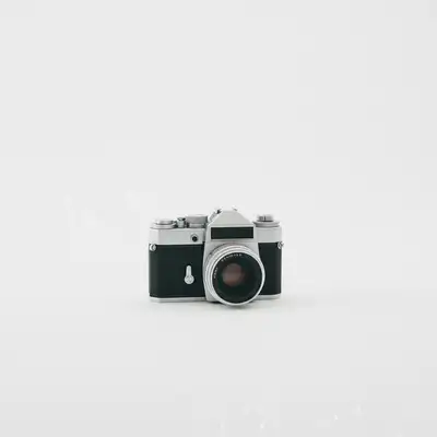 Câmera antiga fotografada em mesa de escritório doméstico bagunçada. Um prompt criou uma foto de listagem limpa e profissional.